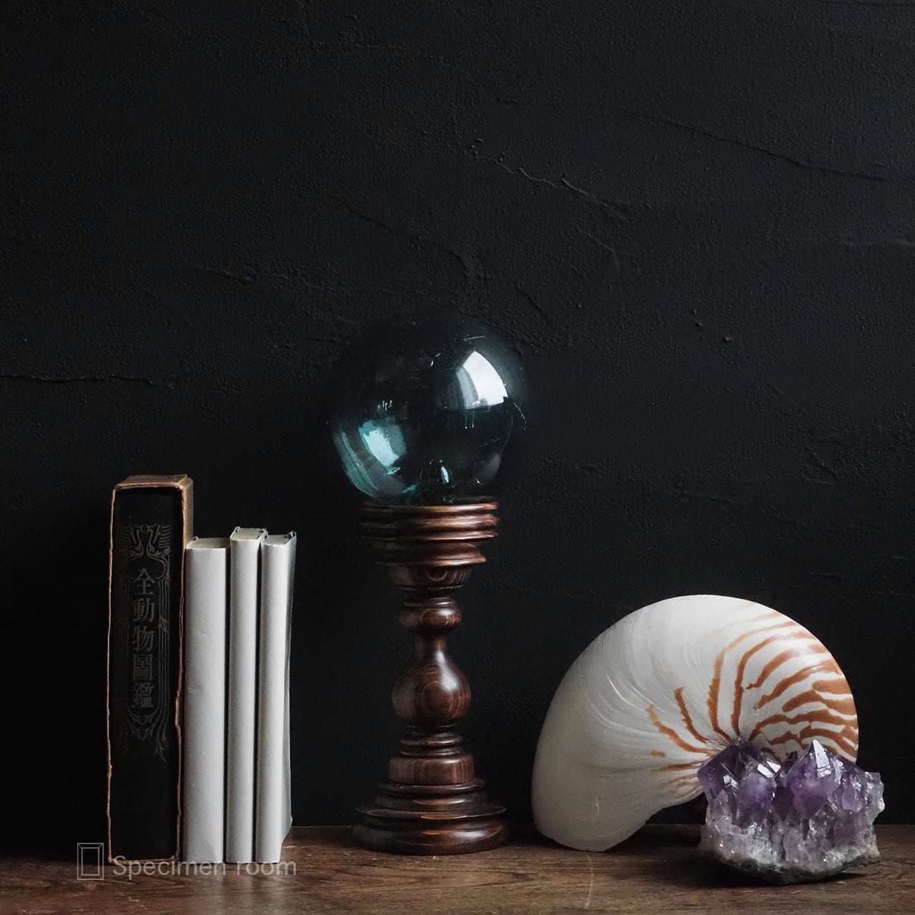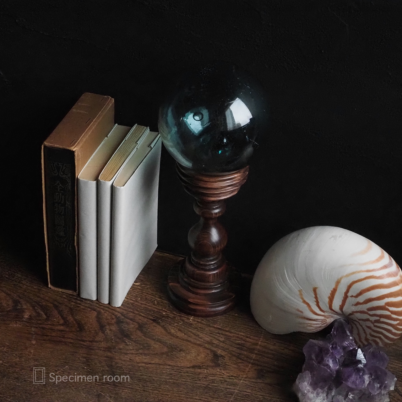 画像の本、鉱物、ガラスの浮き玉オブジェ以外の標本等は撮影用の小物です