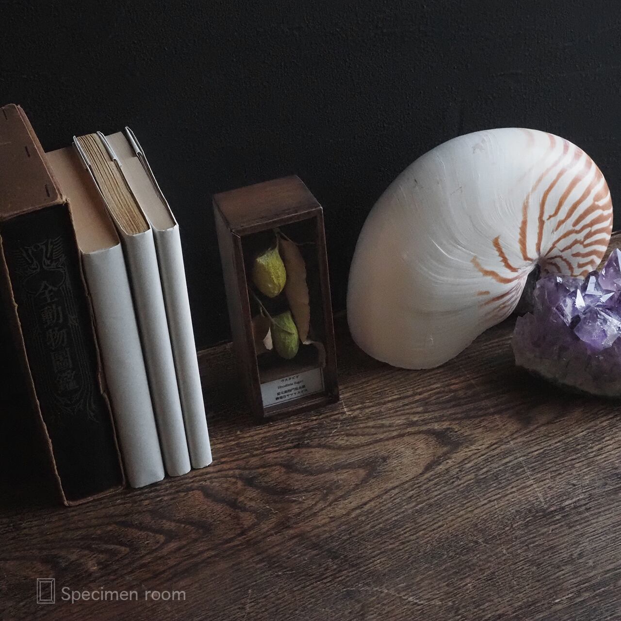 画像の本、鉱物、ウスタビガの繭以外の標本等は撮影用の小物です