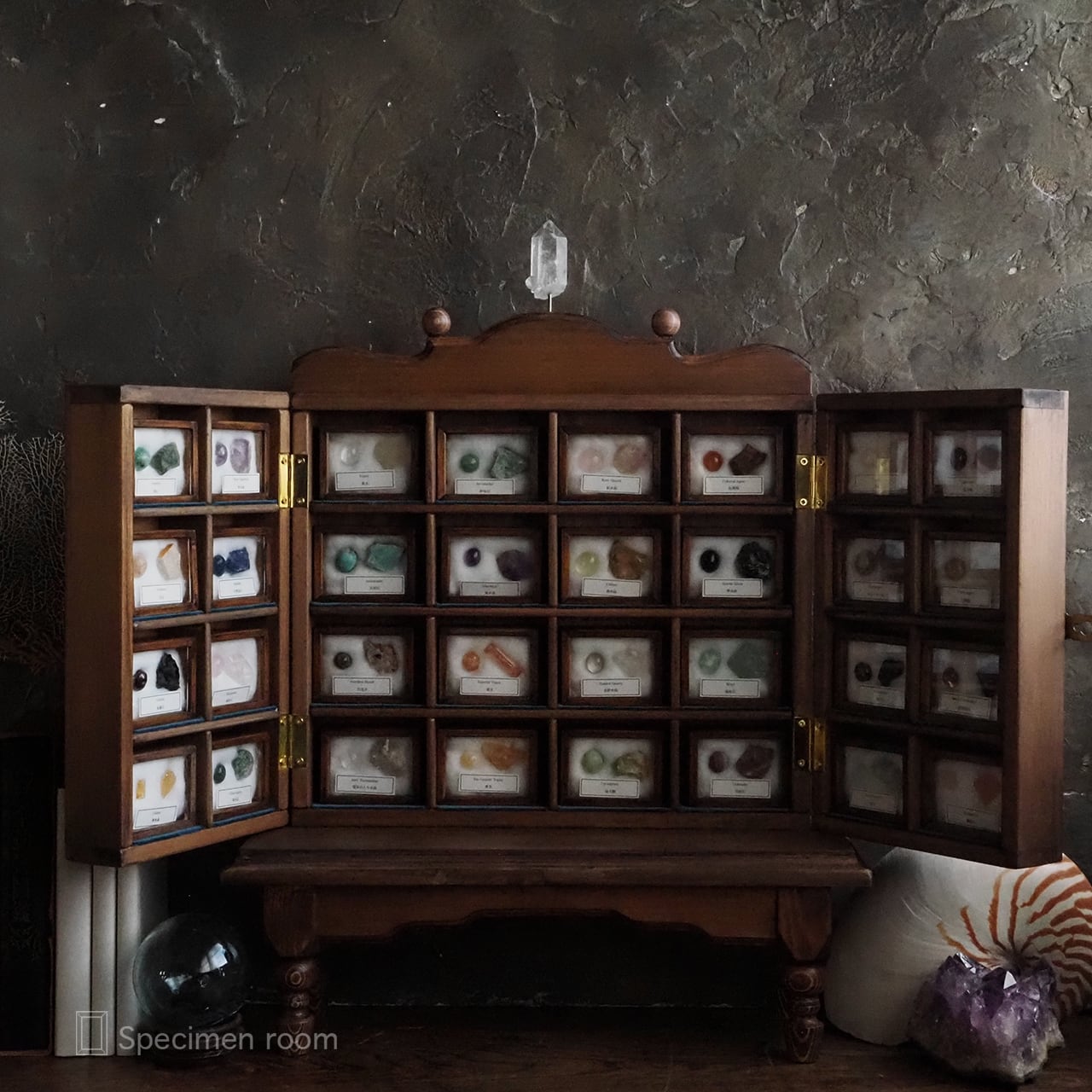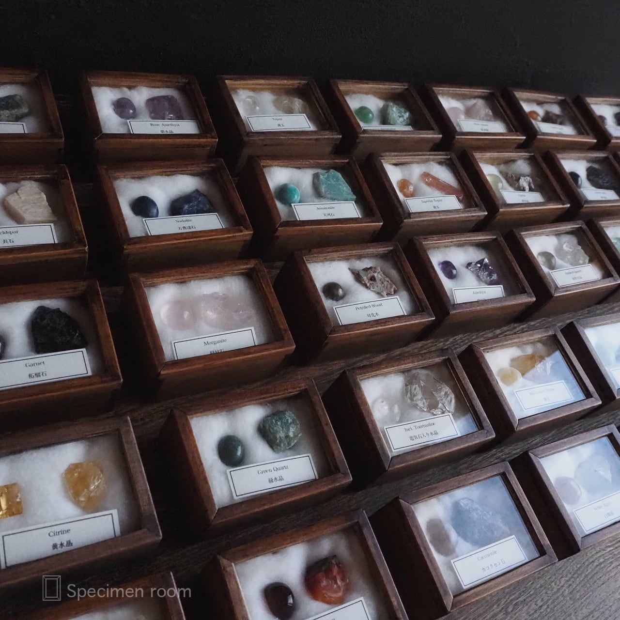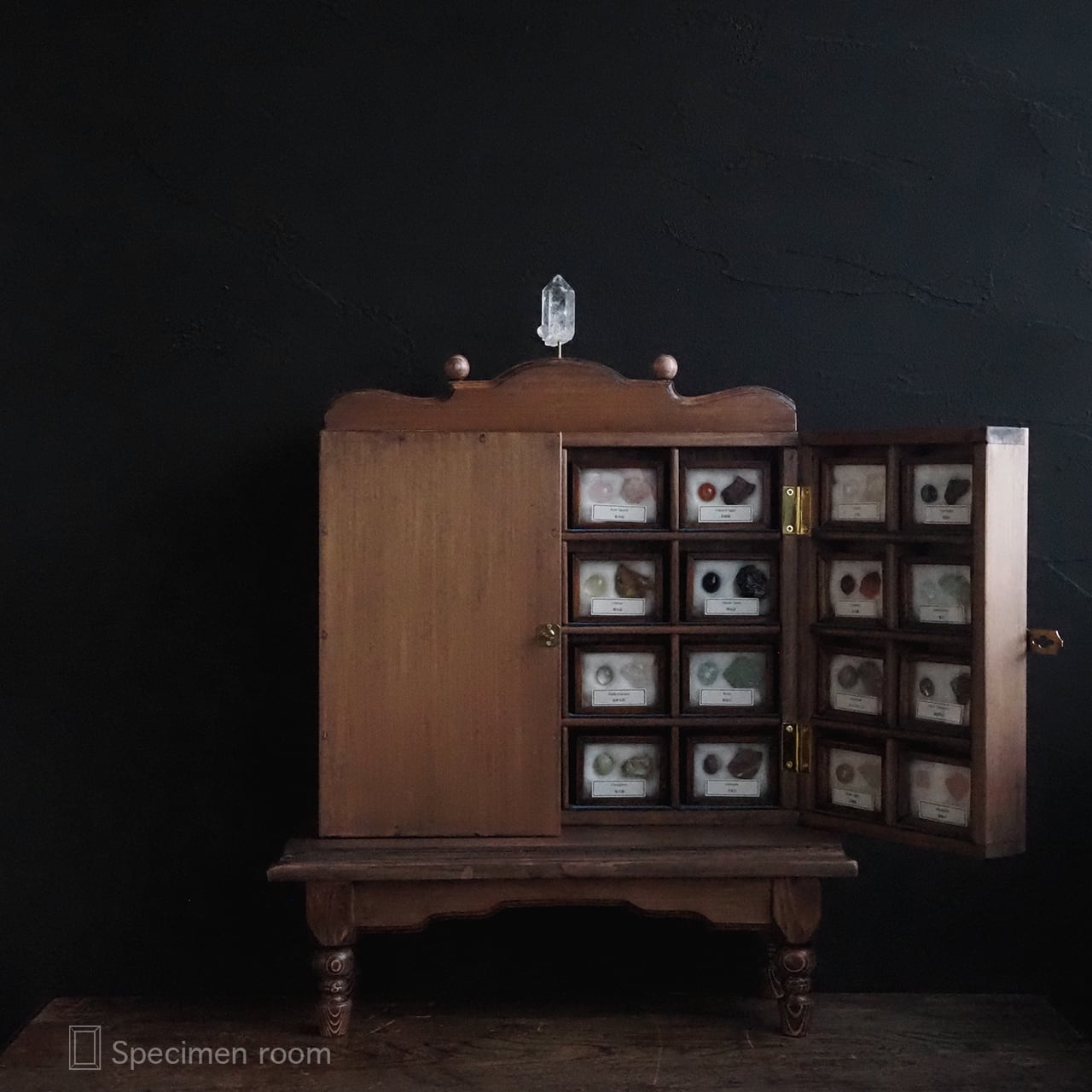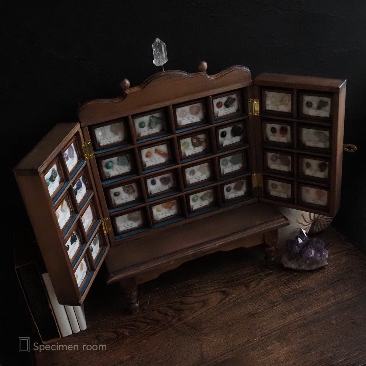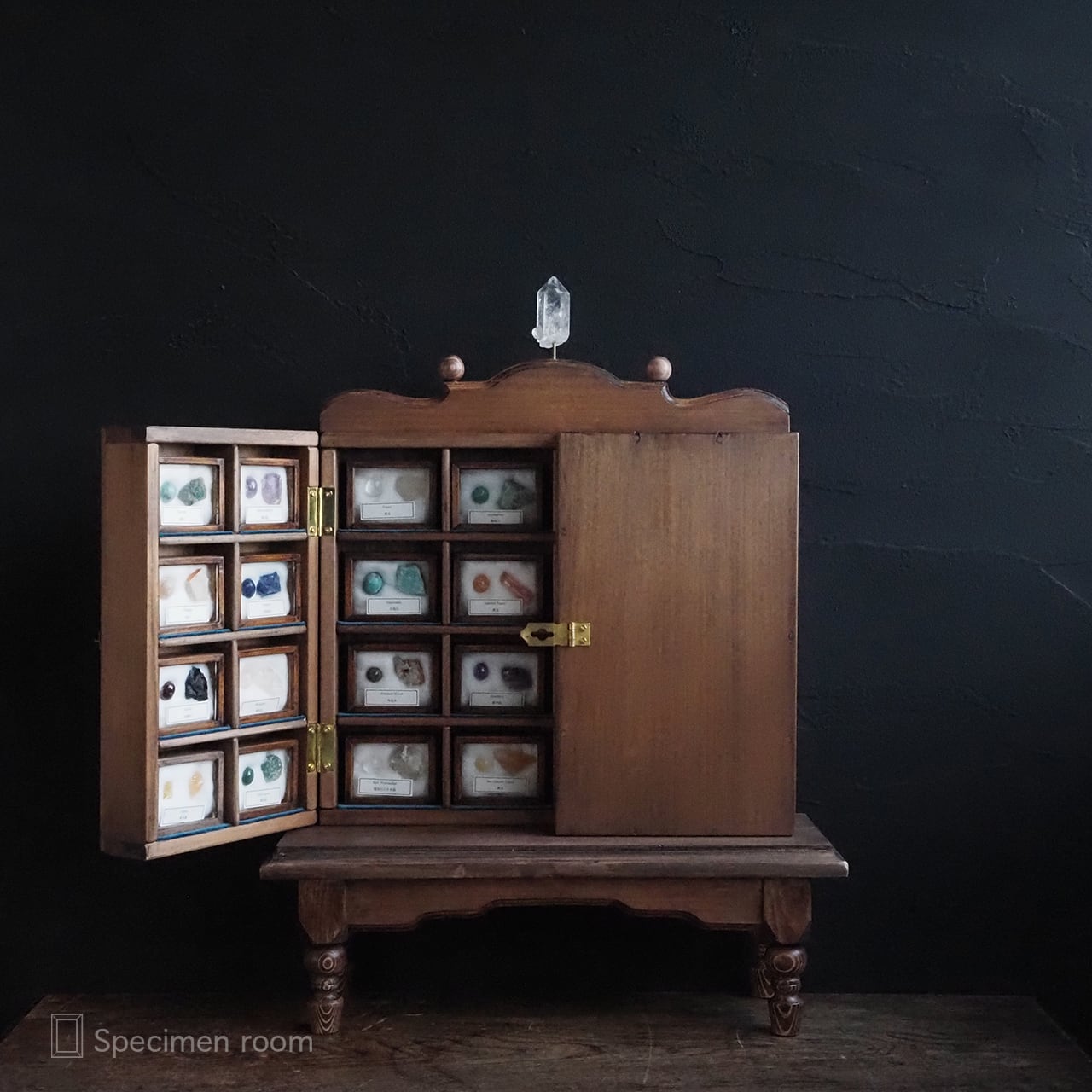 鉱物以外の標本箱や飾り棚は全て一から新たに手作りました。