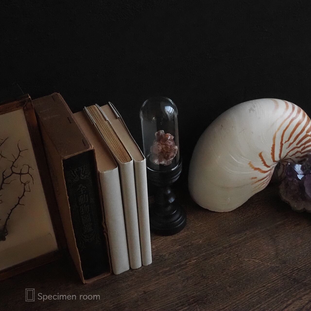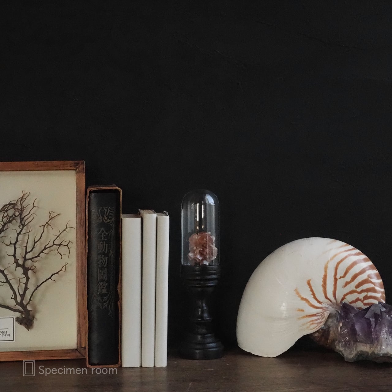 オウムガイや標本、鉱物、本等は撮影用の小物です
