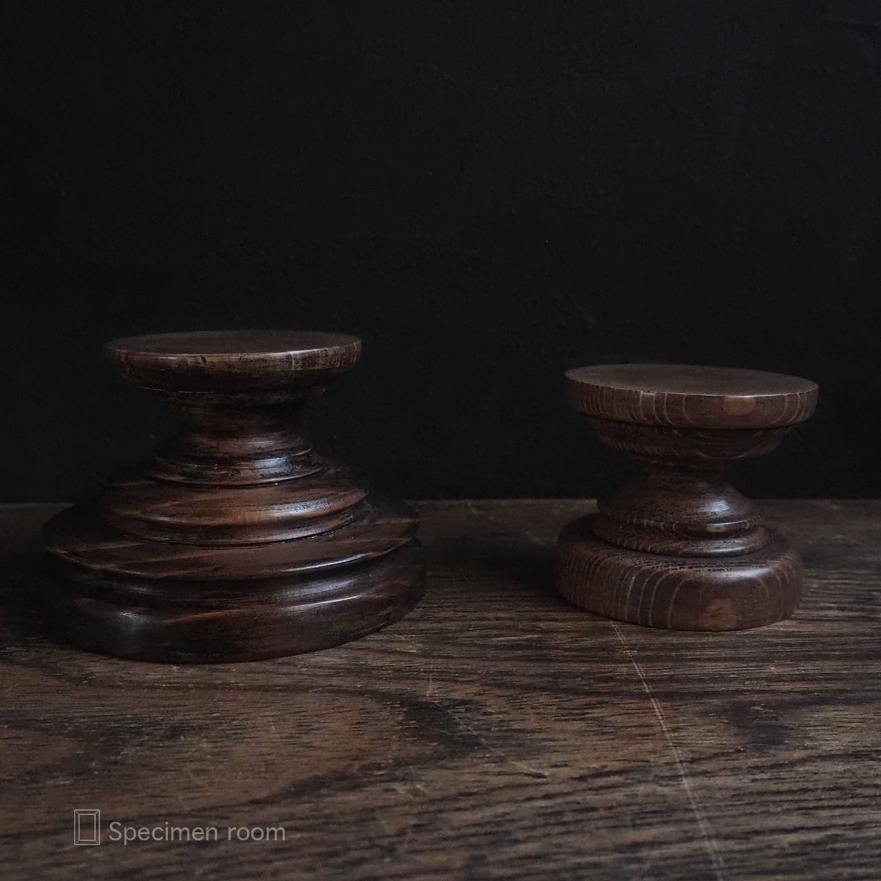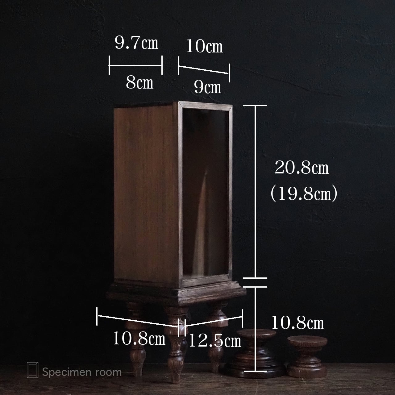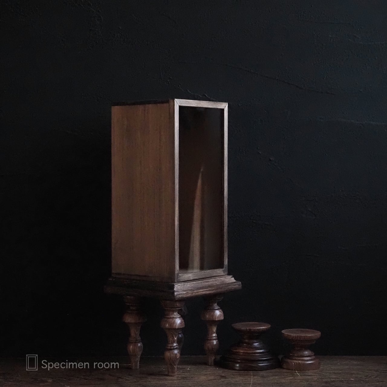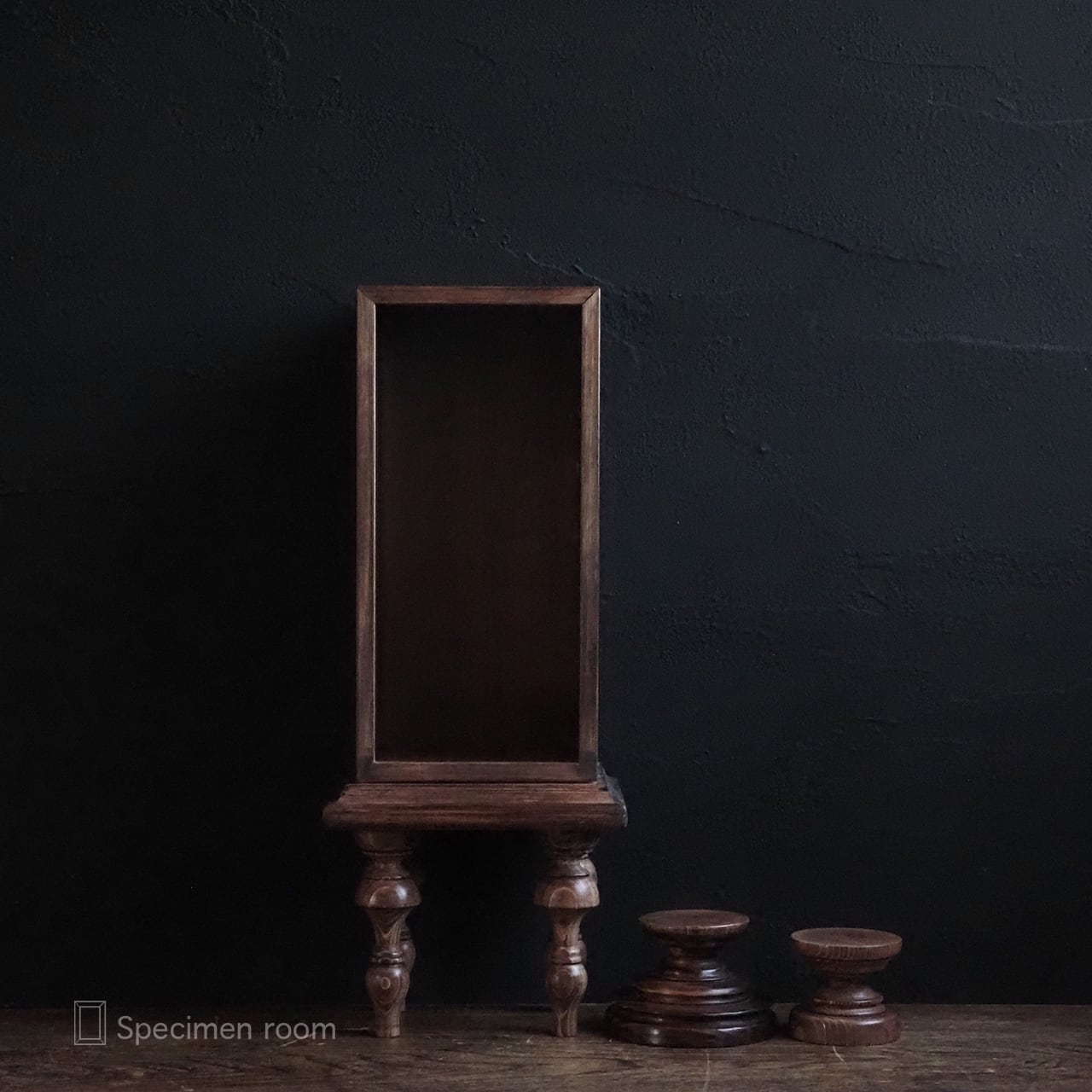 4本脚付き縦長標本箱(大小の台座付き)。