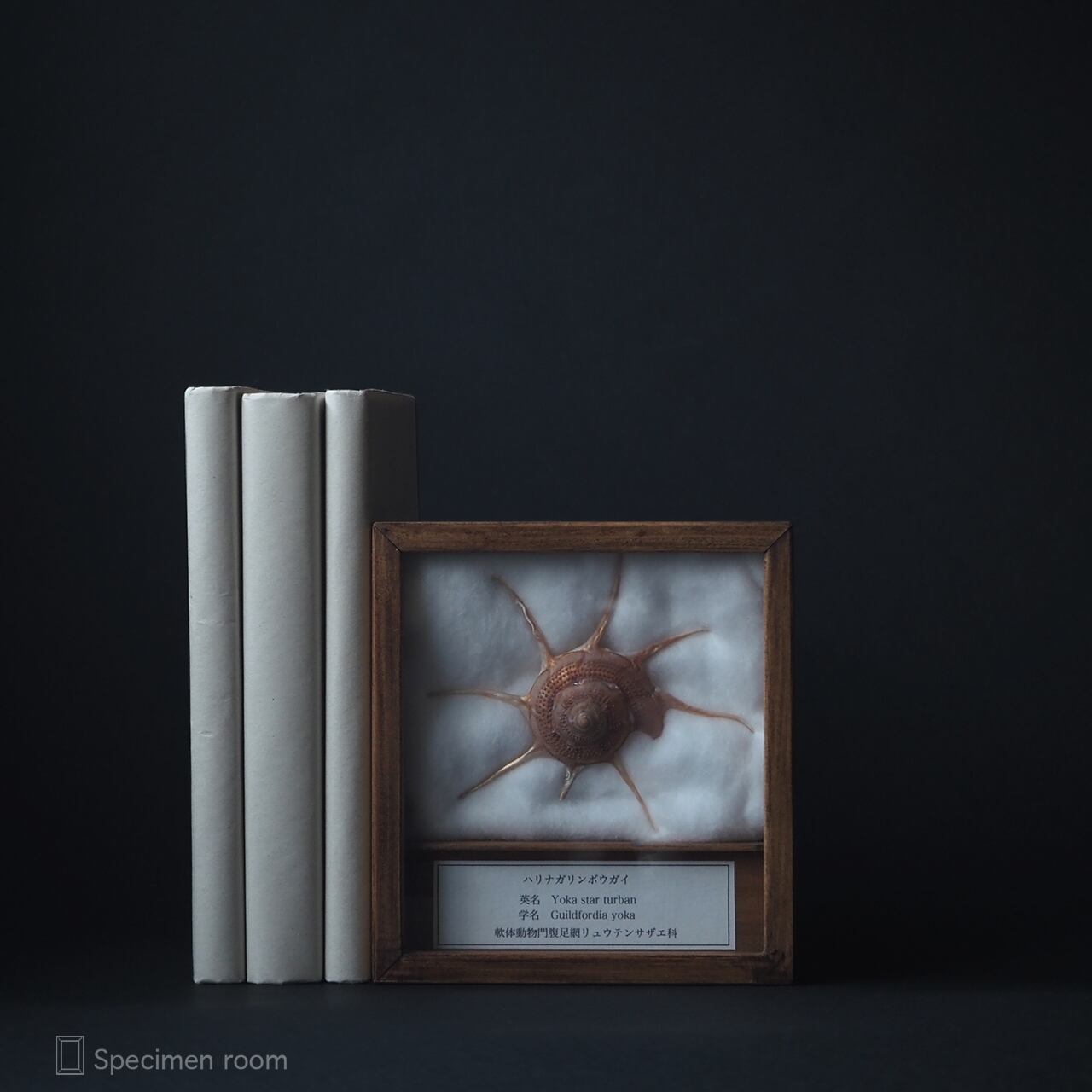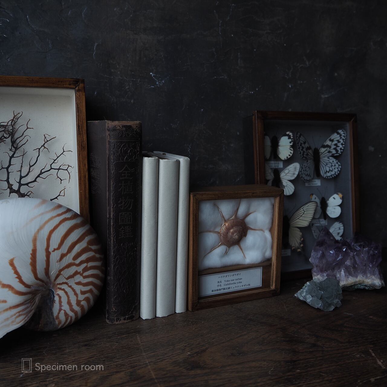 画像の鉱石や本、ハリナガリンボウガイ標本以外の標本等は撮影用の小物です