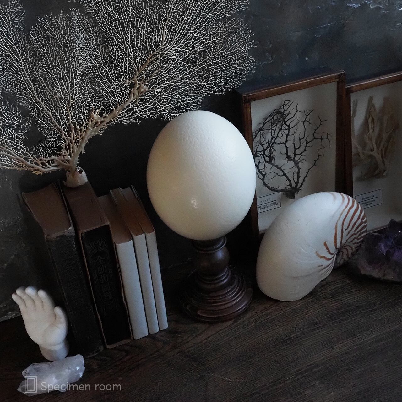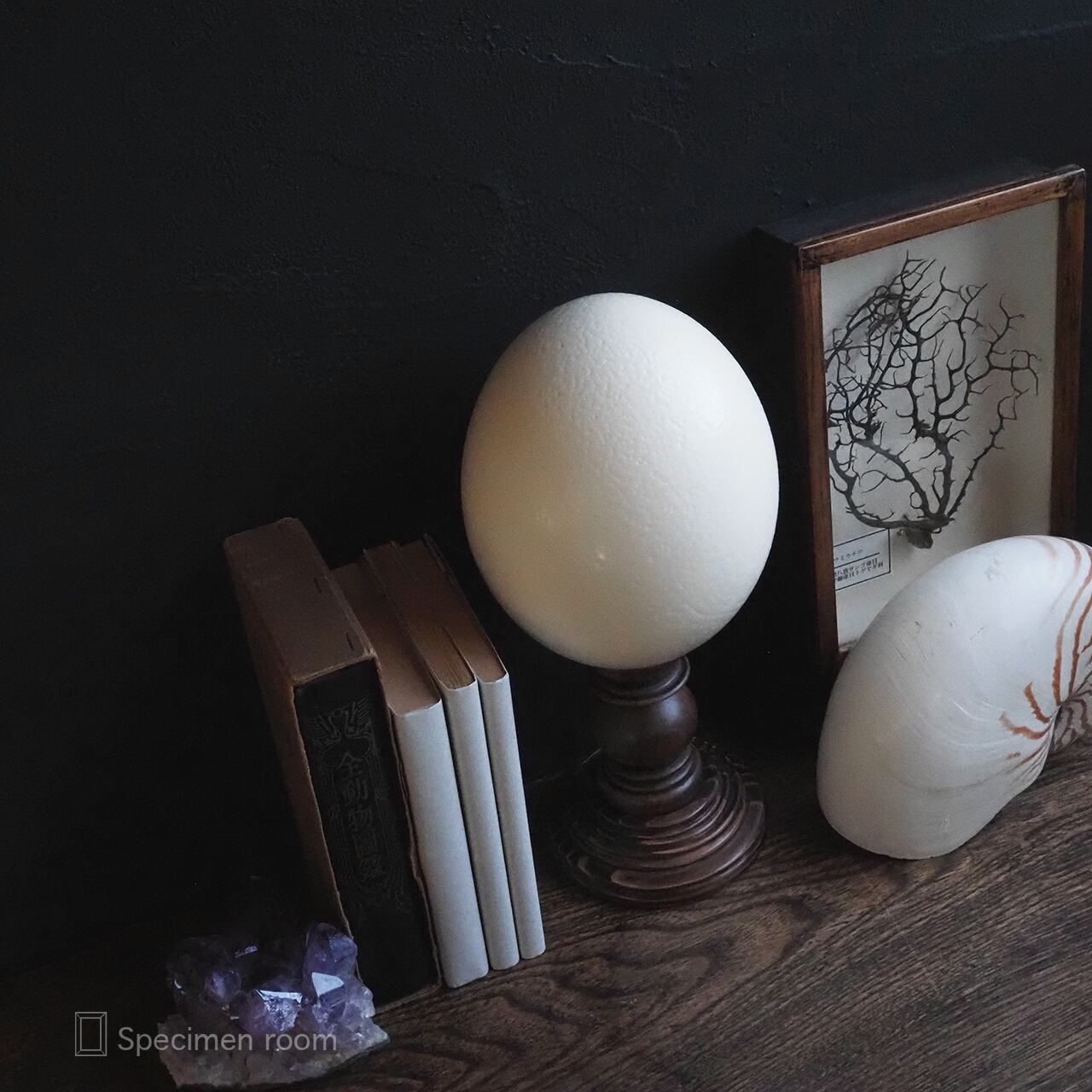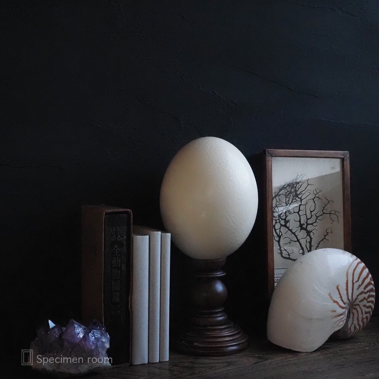 画像の本、オウムガイの殻等ダチョウの卵の標本以外の物は撮影用の小物です