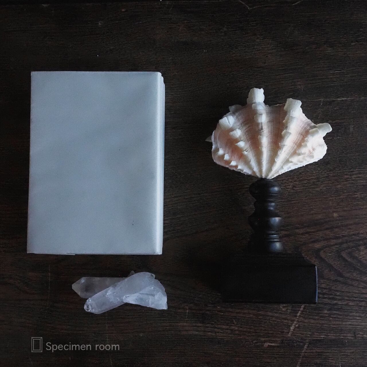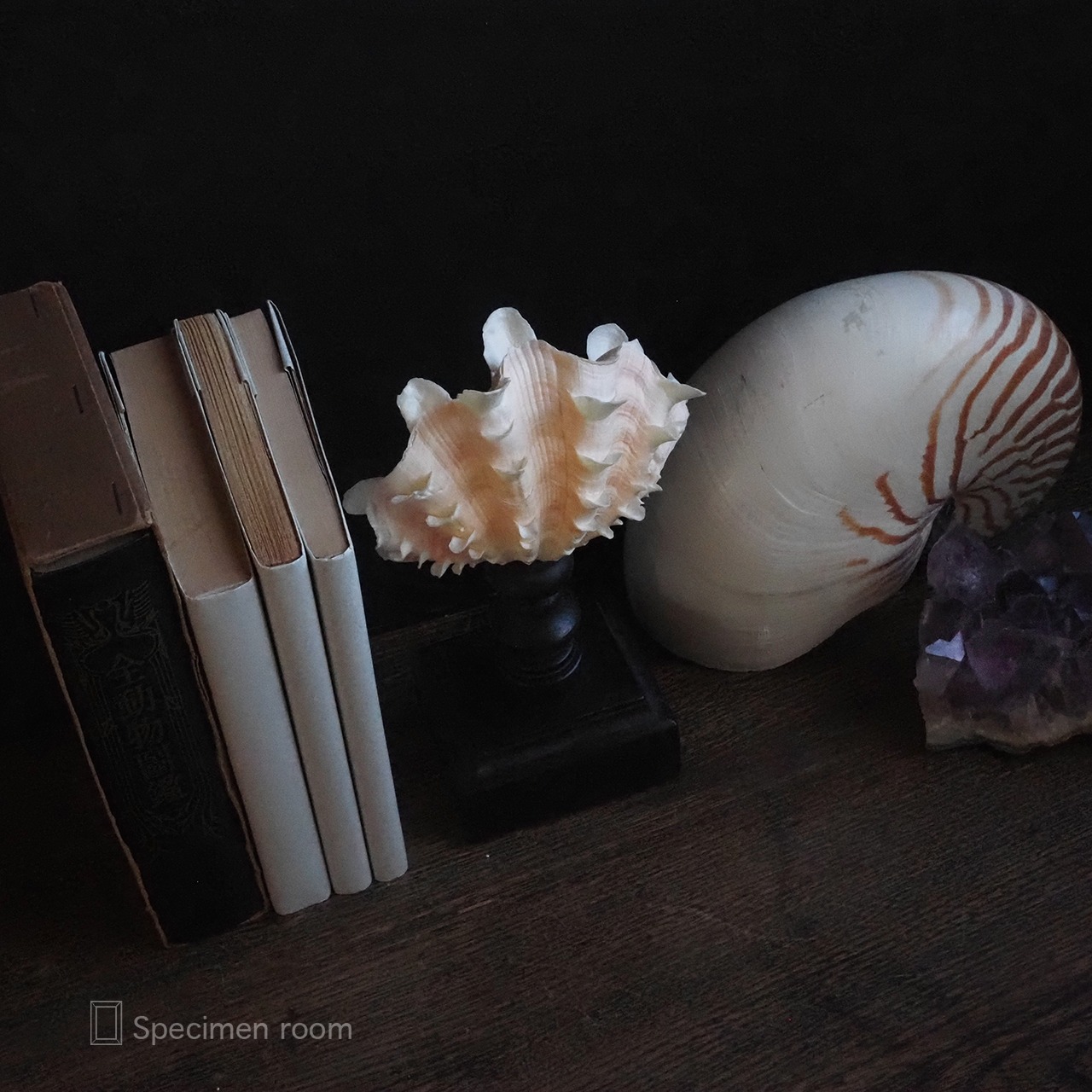 画像の鉱石や本、ヒレシャコガイの標本以外の標本等は撮影用の小物です
